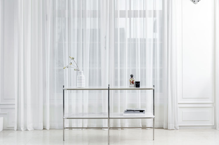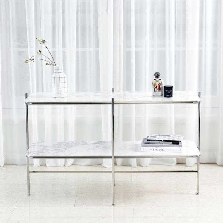이단으로 되어 있는 화이트 아라베스카토 세라믹이 실용성을 강조한 콘솔입니다.
